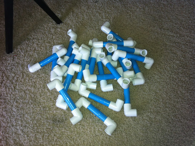 I bought bright blue duct tape and wrapped the PVC pipe with the tape to make them WAY more cute!