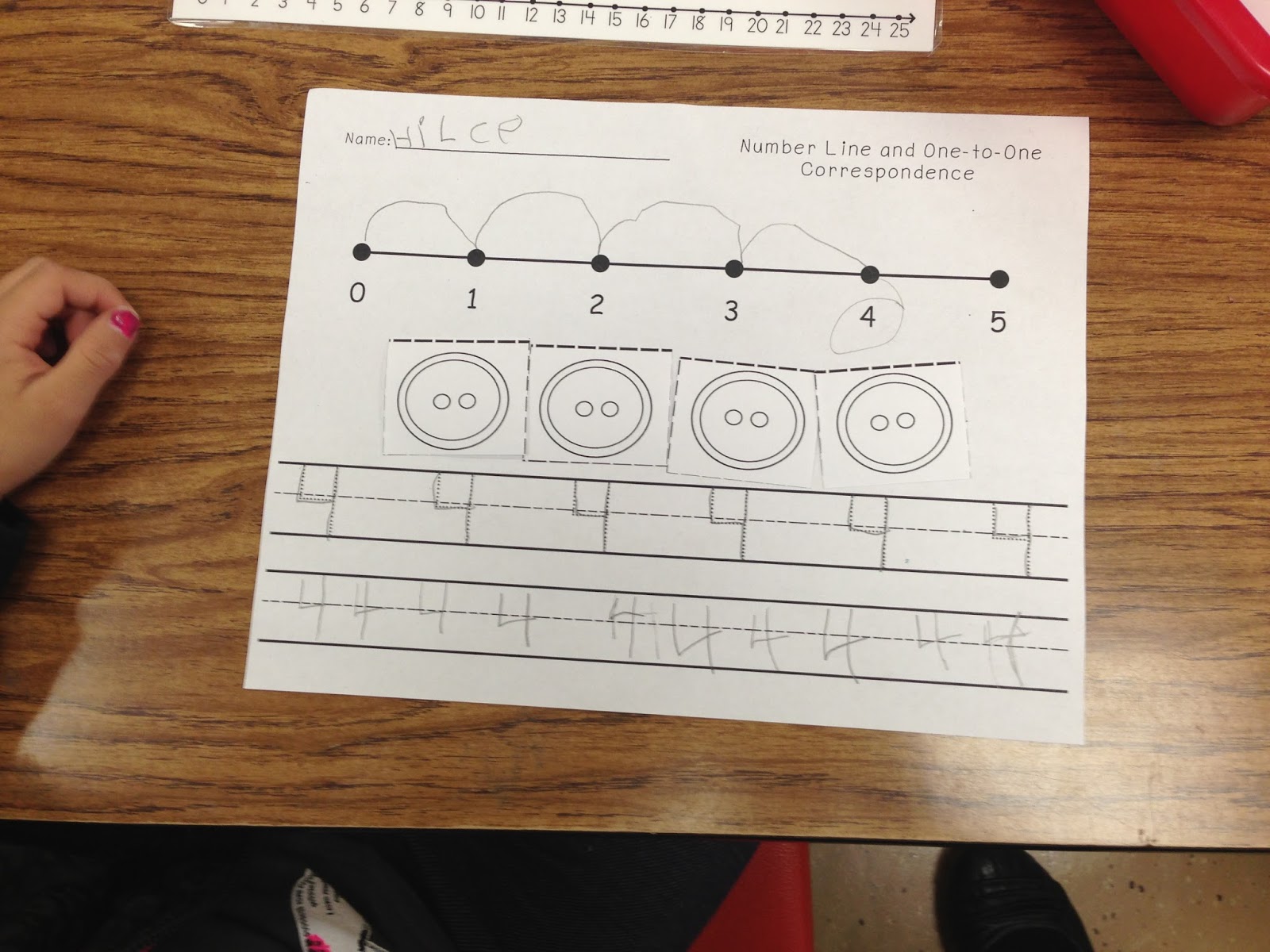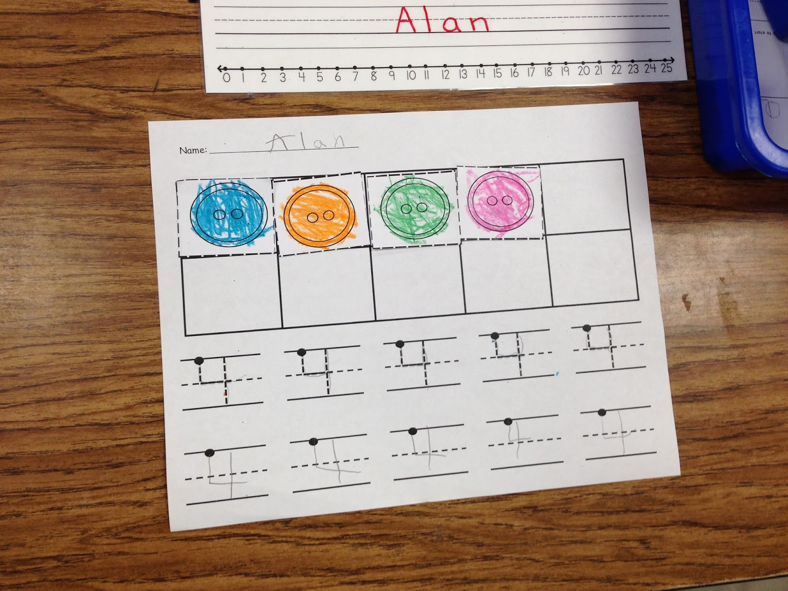 Trace, Write, Fill in the ten frame cut/glue for the number 4. We used buttons to go along with the story.