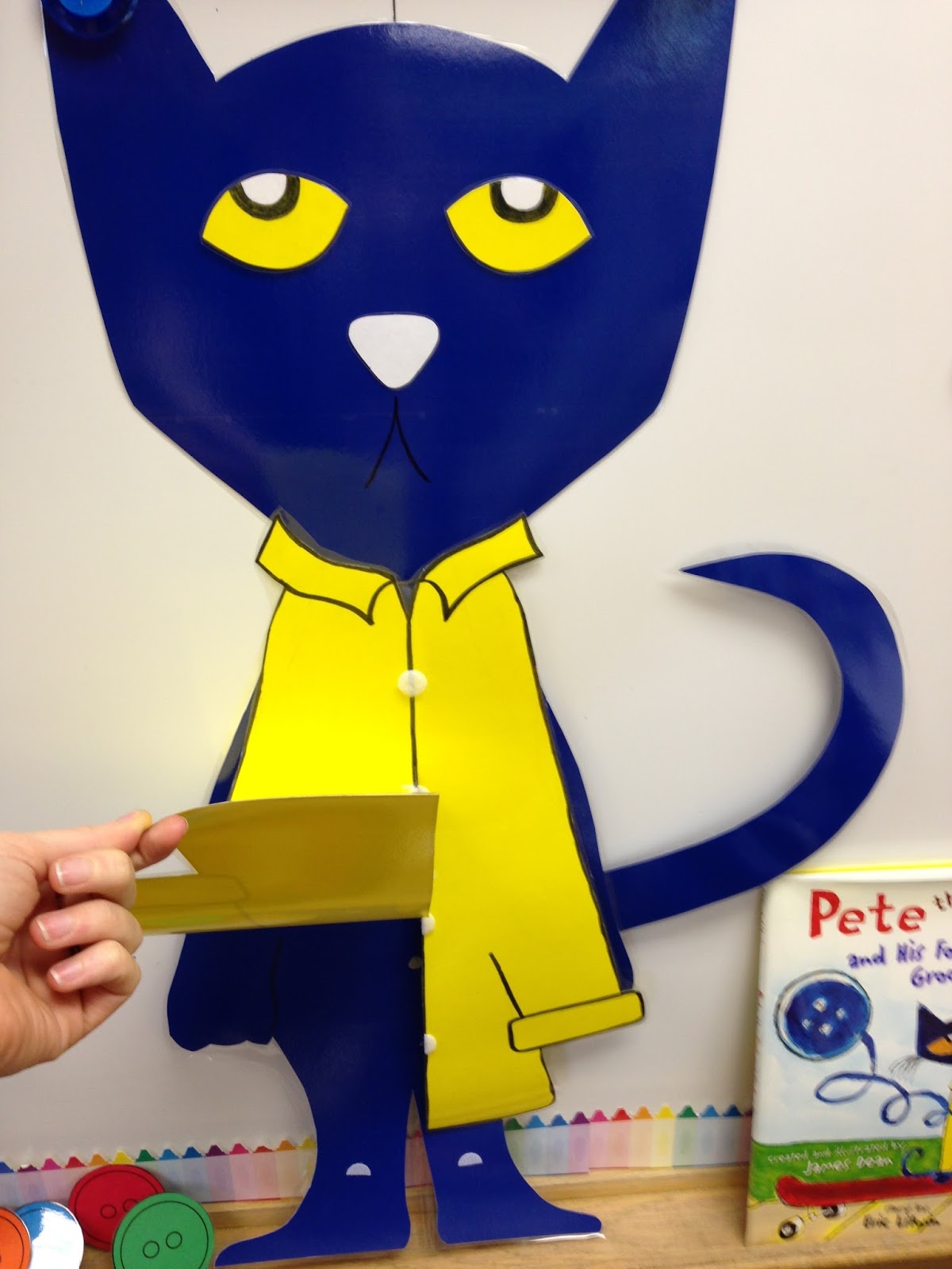 We made Pete the Cat! Each student got 4 buttons for his shirt, but we did not glue them on so that they could retell the story. I gave them a baggie to put the buttons in so that they could retell the story at home. You can grab this Pete the Cat Craft Template HERE