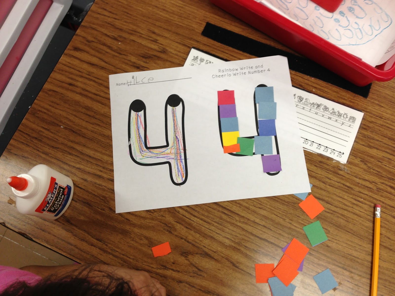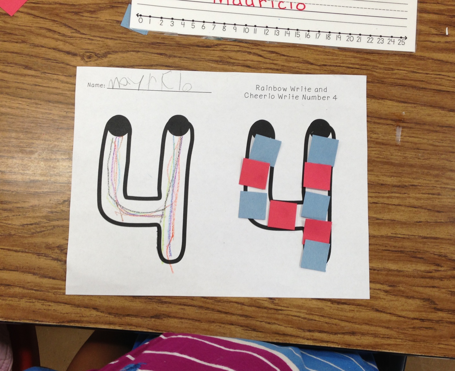 We talked about squares this week, so we rainbow wrote 4 and filled in the 4 with squares.