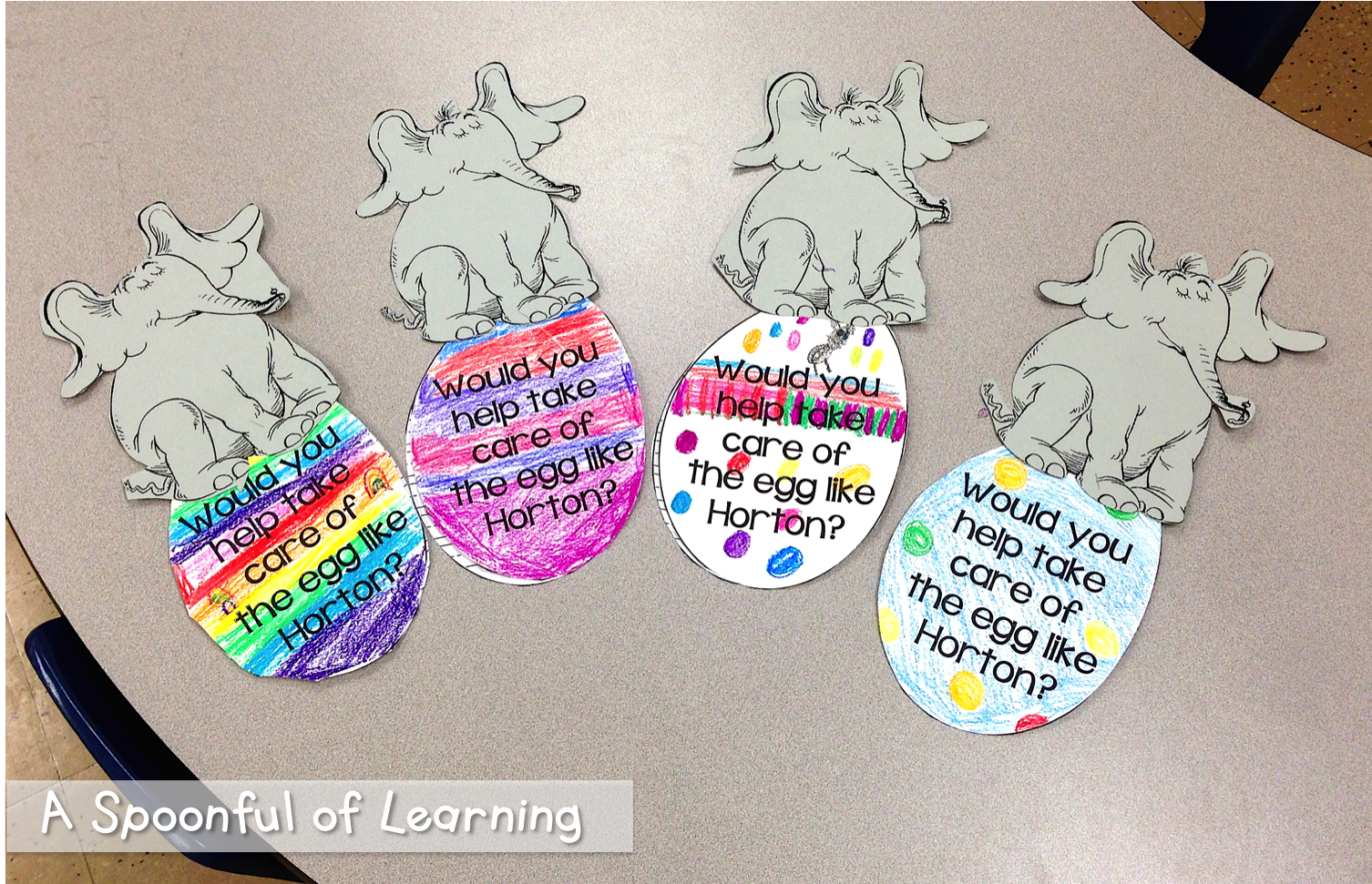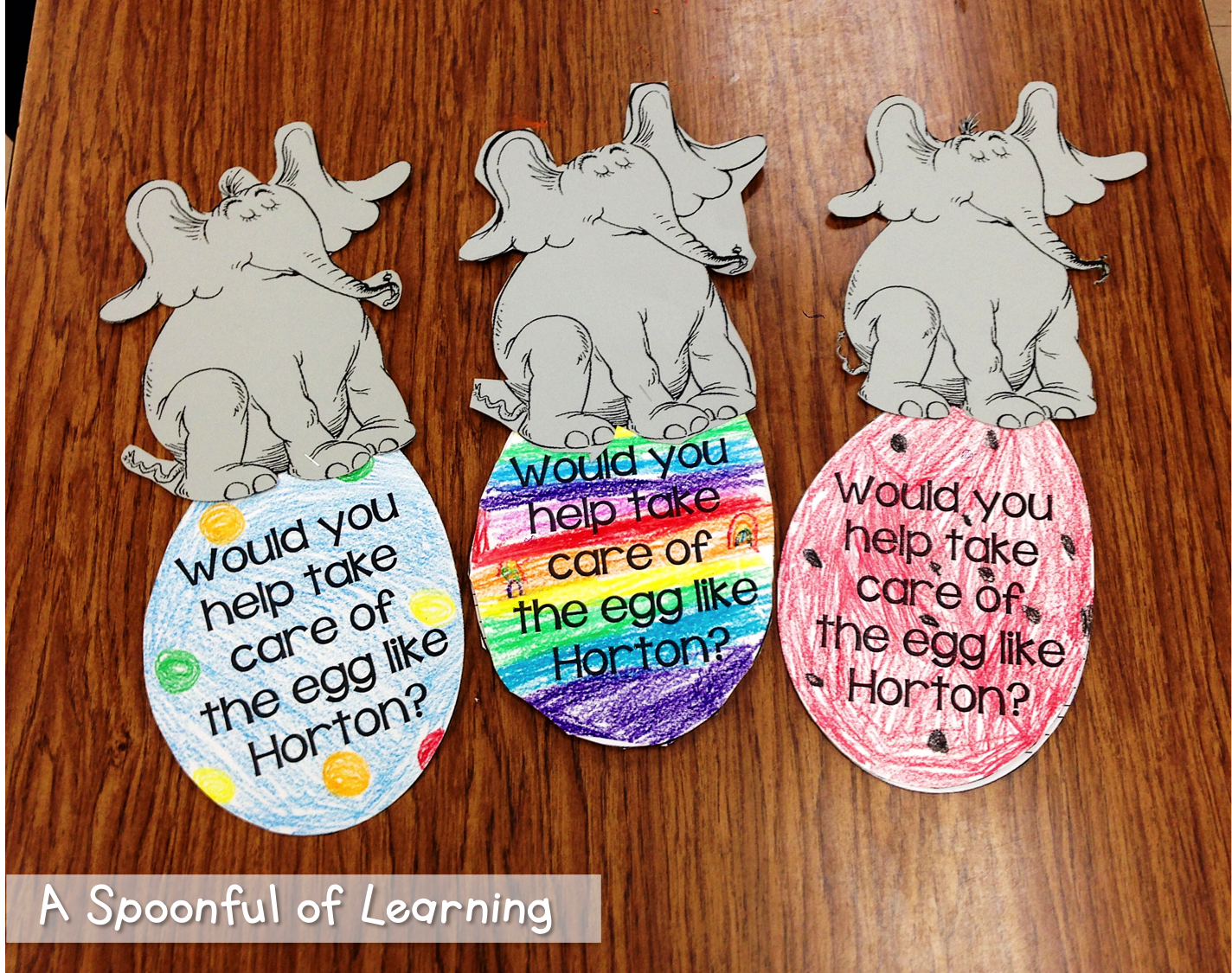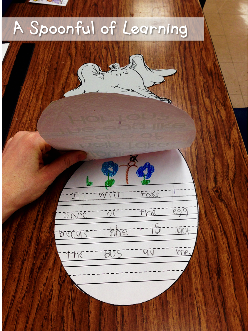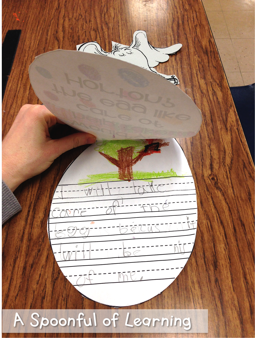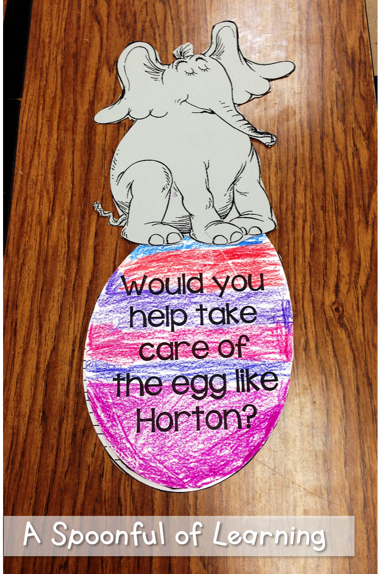 After reading Horton Hatches an Egg, we talked about whether or not we would take care of the egg like Horton. Then we talked about why or why not. We wrote about it on an egg shaped writing page and then turned it into a craft with Horton sitting on the egg! I let the students decorate their egg however they wanted. They turned out so cute! You can grab this activity HERE!