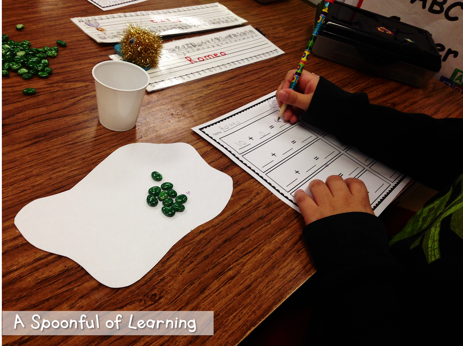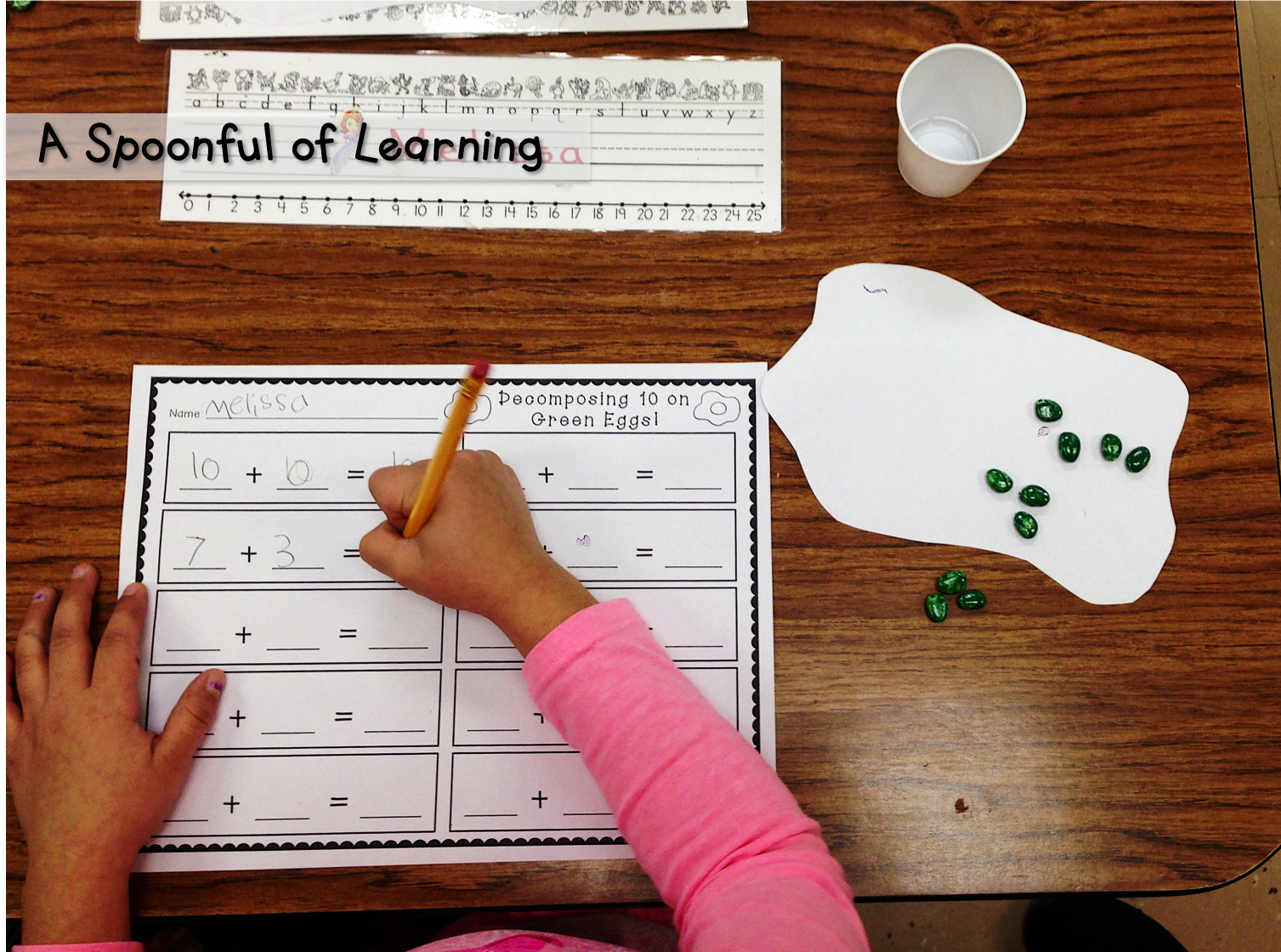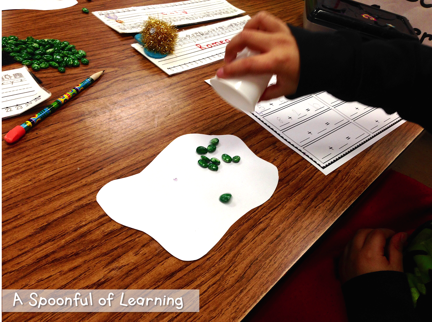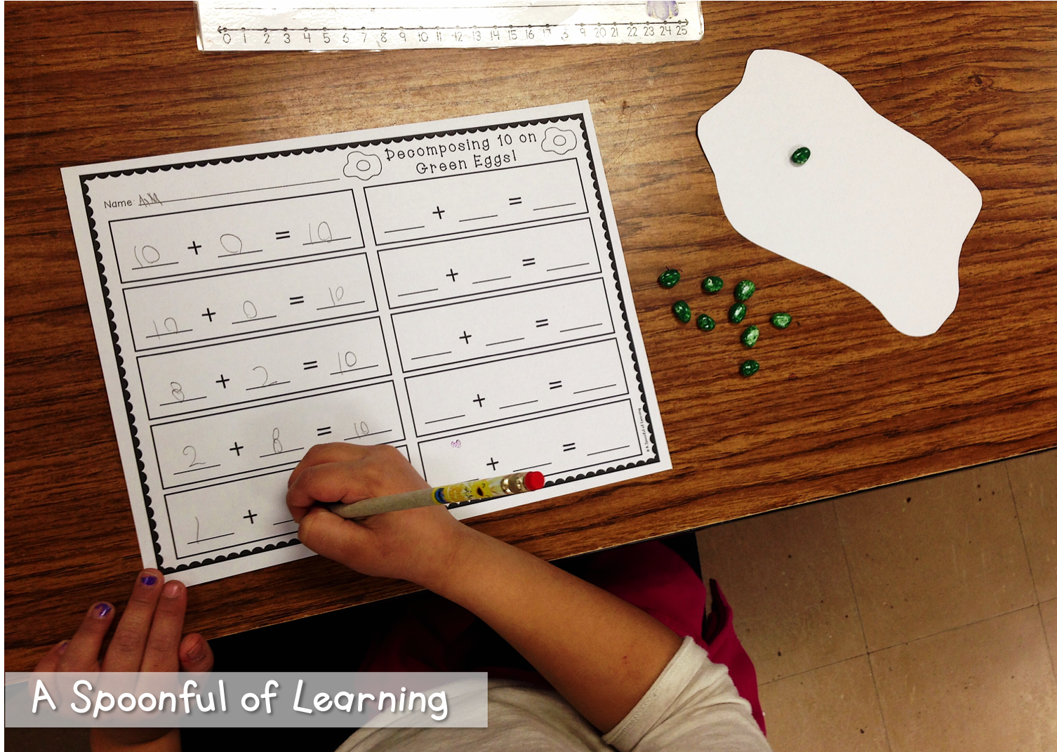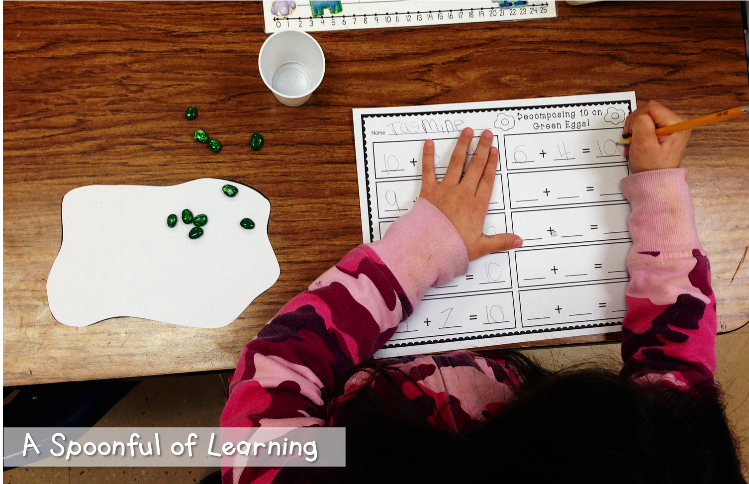 We had a blast decomposing 10 today! Each student had an egg shaped paper. They spilled ten beans (spray painted green) onto the egg. They looked to see how many beans landed on the egg and how many landed off the egg to determine an addition equation that equals 10. You can grab this activity HERE!