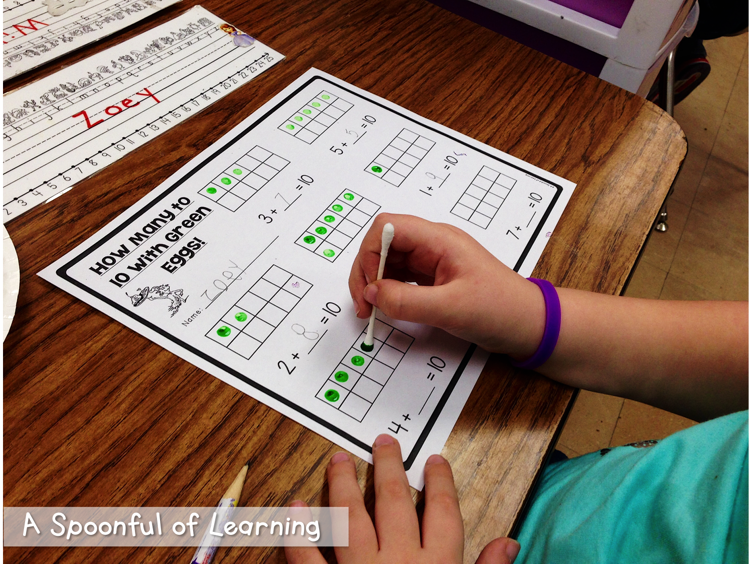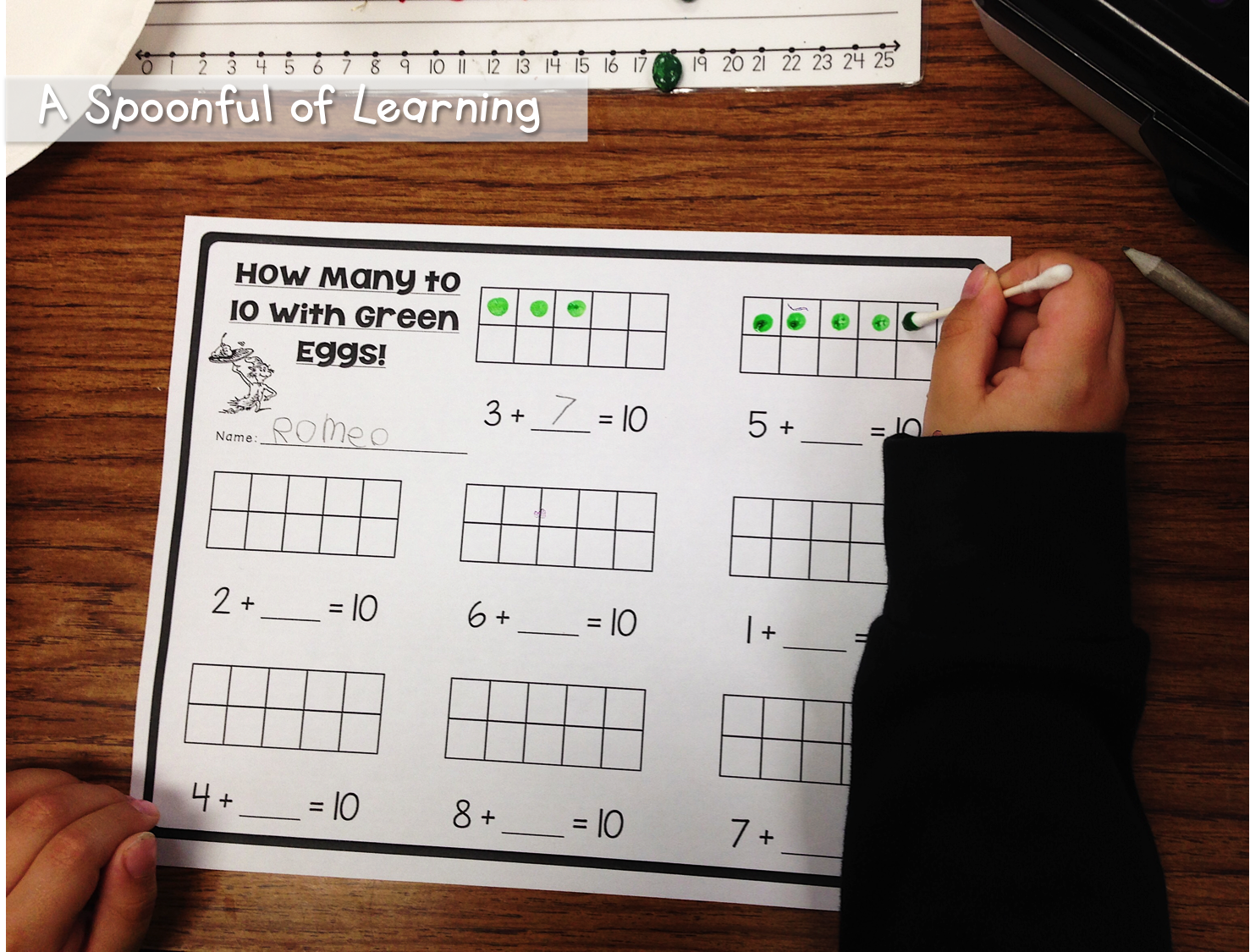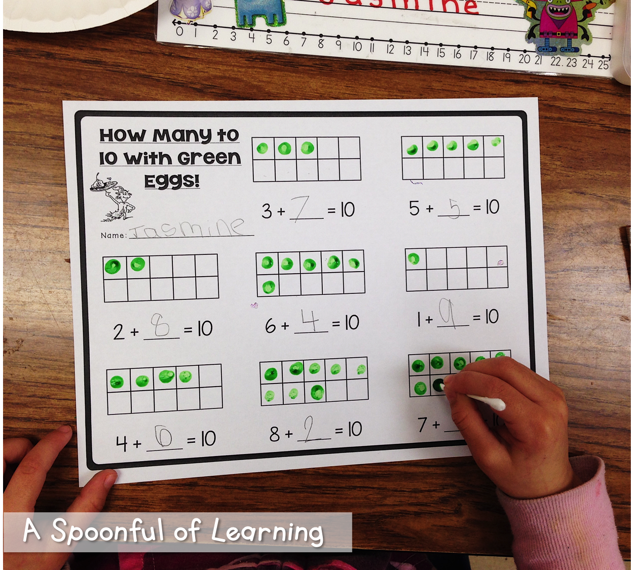 Then we determined how many to ten using a ten frame. We painted green dots using a Q-tip in the ten frame to help us determine how many more we needed to make 10. You can grab this activity HERE!!