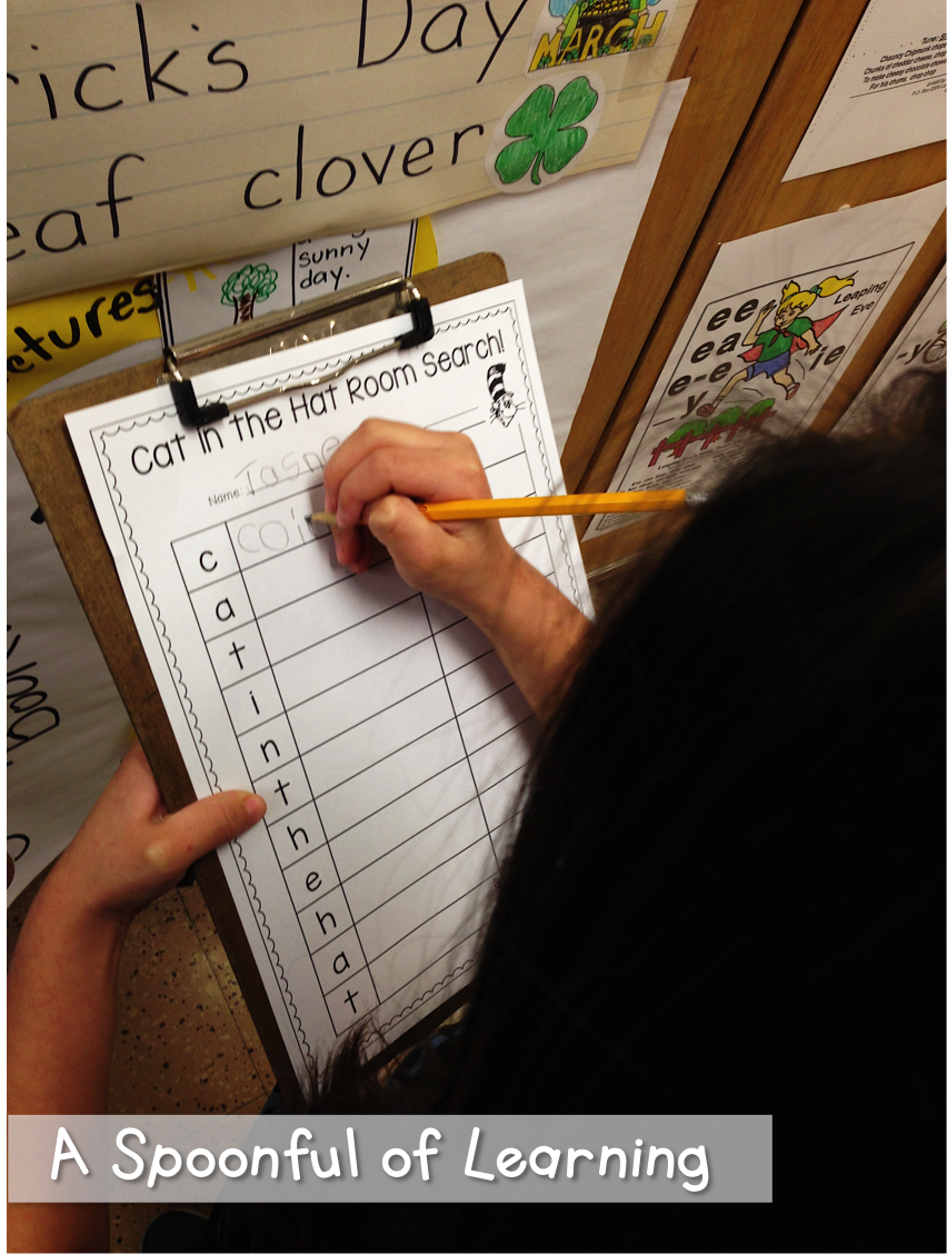 We walked around the room to find words that began with each letter in ‘Cat in the Hat’. You can grab this activity HERE!