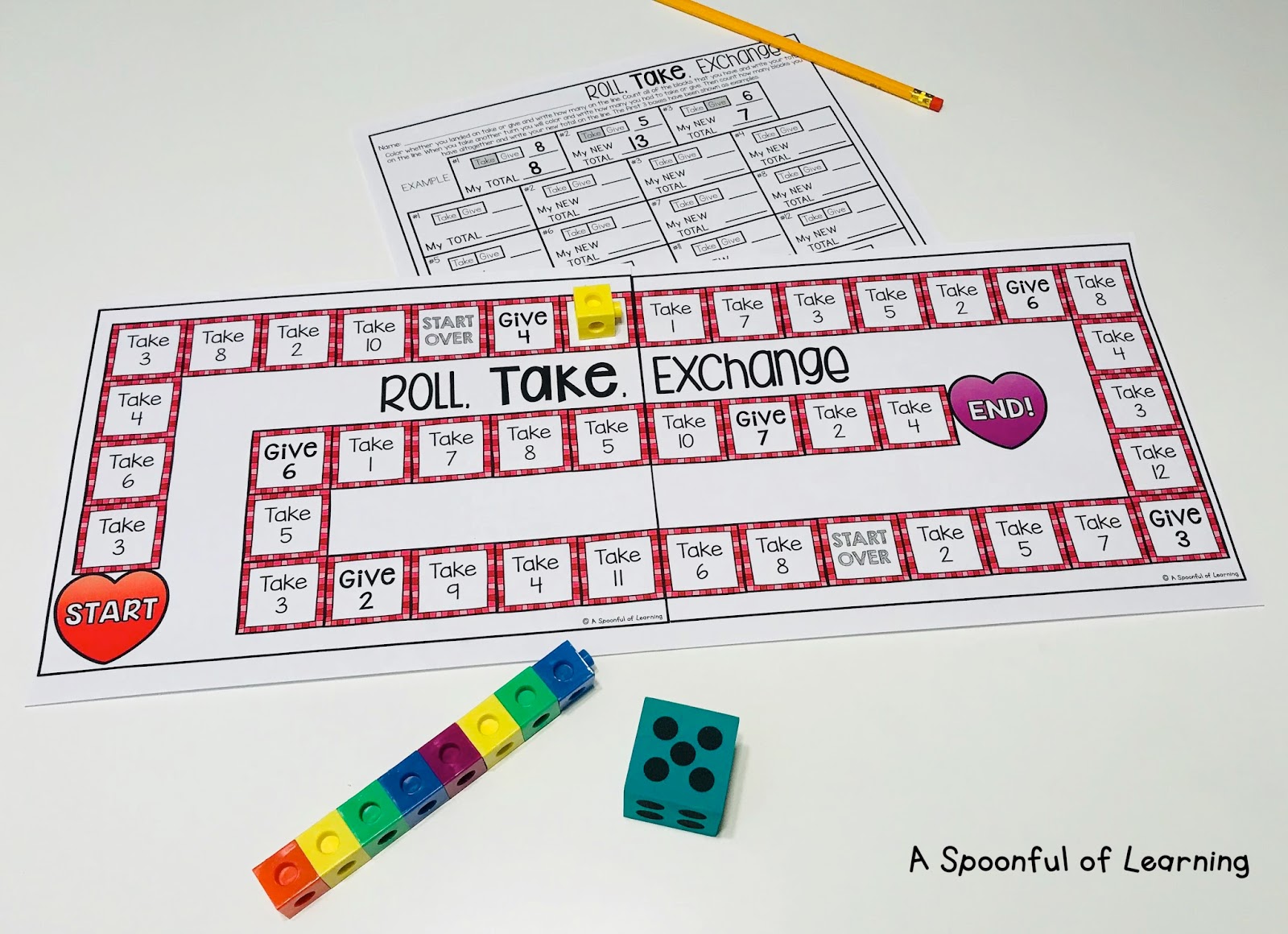 Roll, Take, Exchange: Students will play a game where they add and take away cubes while also determining how many they have total after each turn.