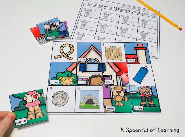 CVCe Words: Students will match the CVCe word to the correct picture on the mat. A mystery picture will be revealed when all of the CVCe words are placed on to the correct pictures.