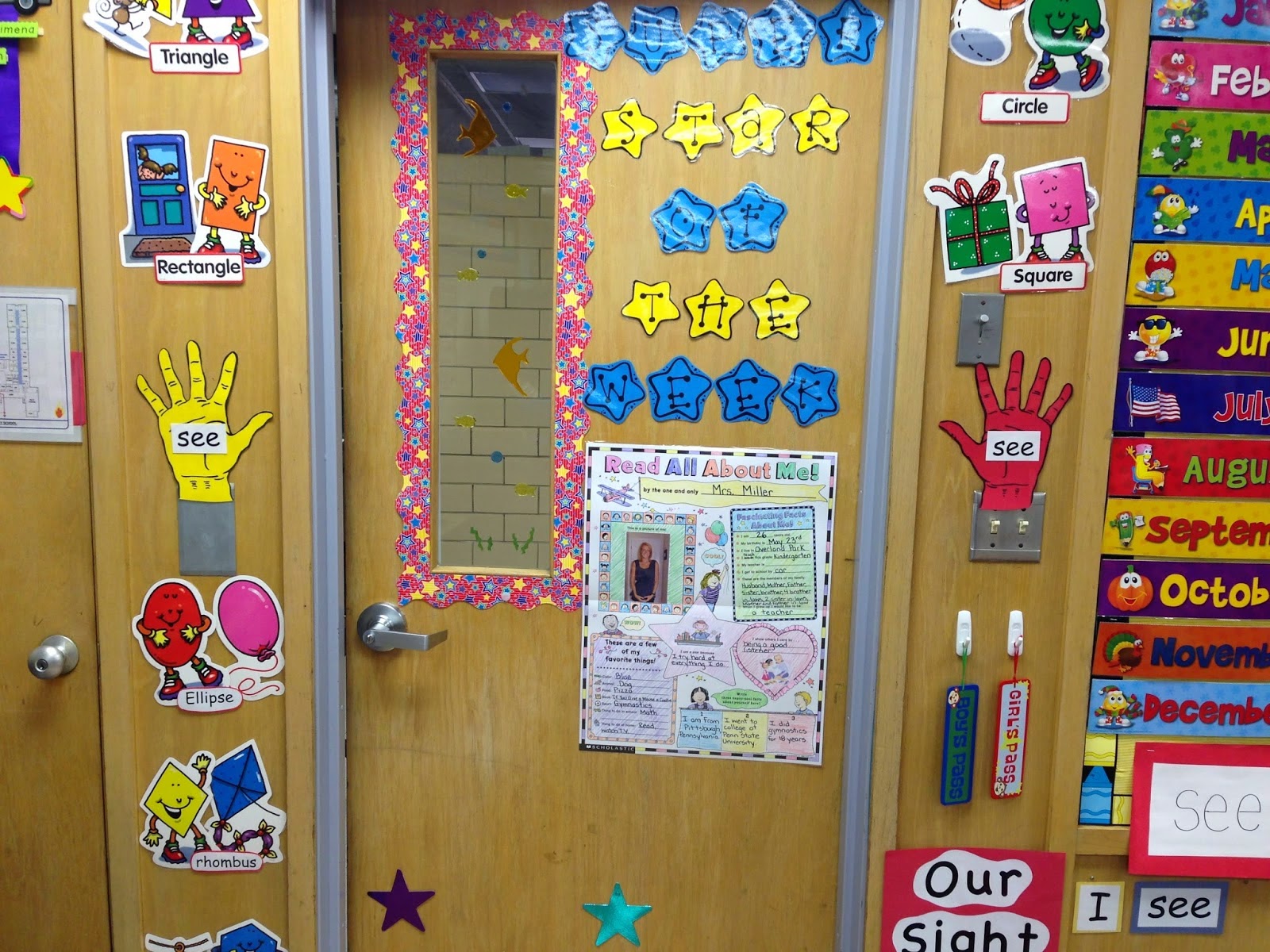 I put a handprint on each side of my door, since my students are grouped into two lines. I place the sight word of the week on the handprints. Anytime we leave the room, we give a high five to the handprint and say the sight word. Not only is this fun, but it really is an easy way to practice identifying and saying the word of the week.