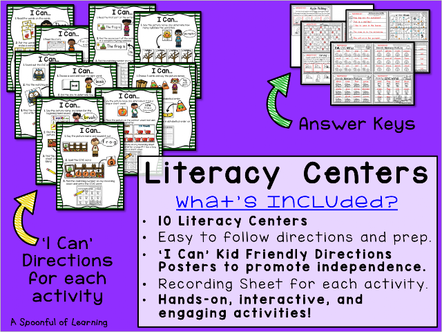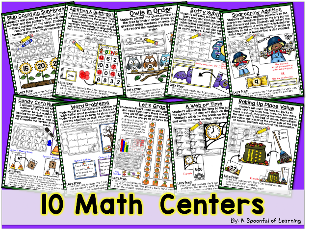 These October centers includes 20 center activities (10 Literacy and 10 Math Activities). A lot of the activities included have multiple options for you to choose from and to differentiate with. You can check my centers here.