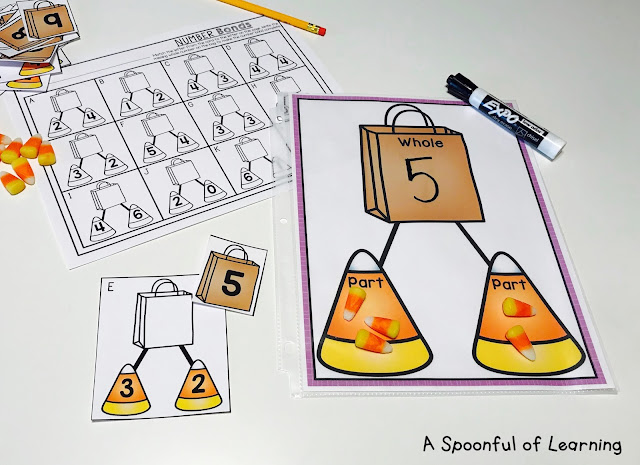 Number Bonds: Students will determine the missing part by acting it out with candy corn (or any manipulative) on the work mat.
