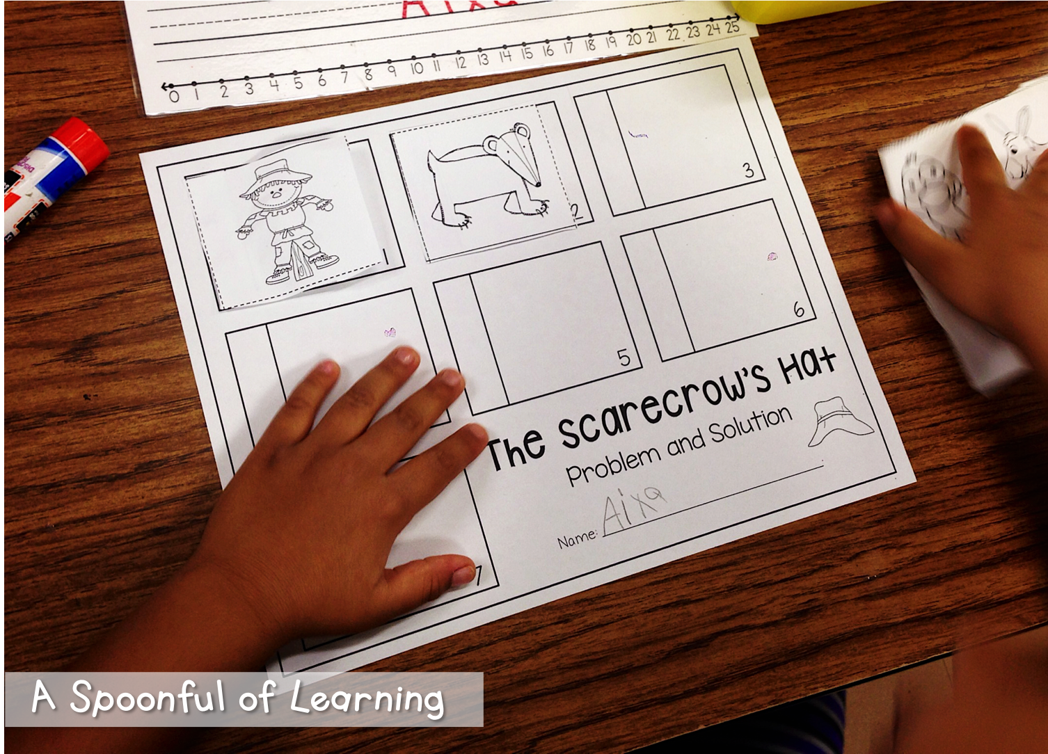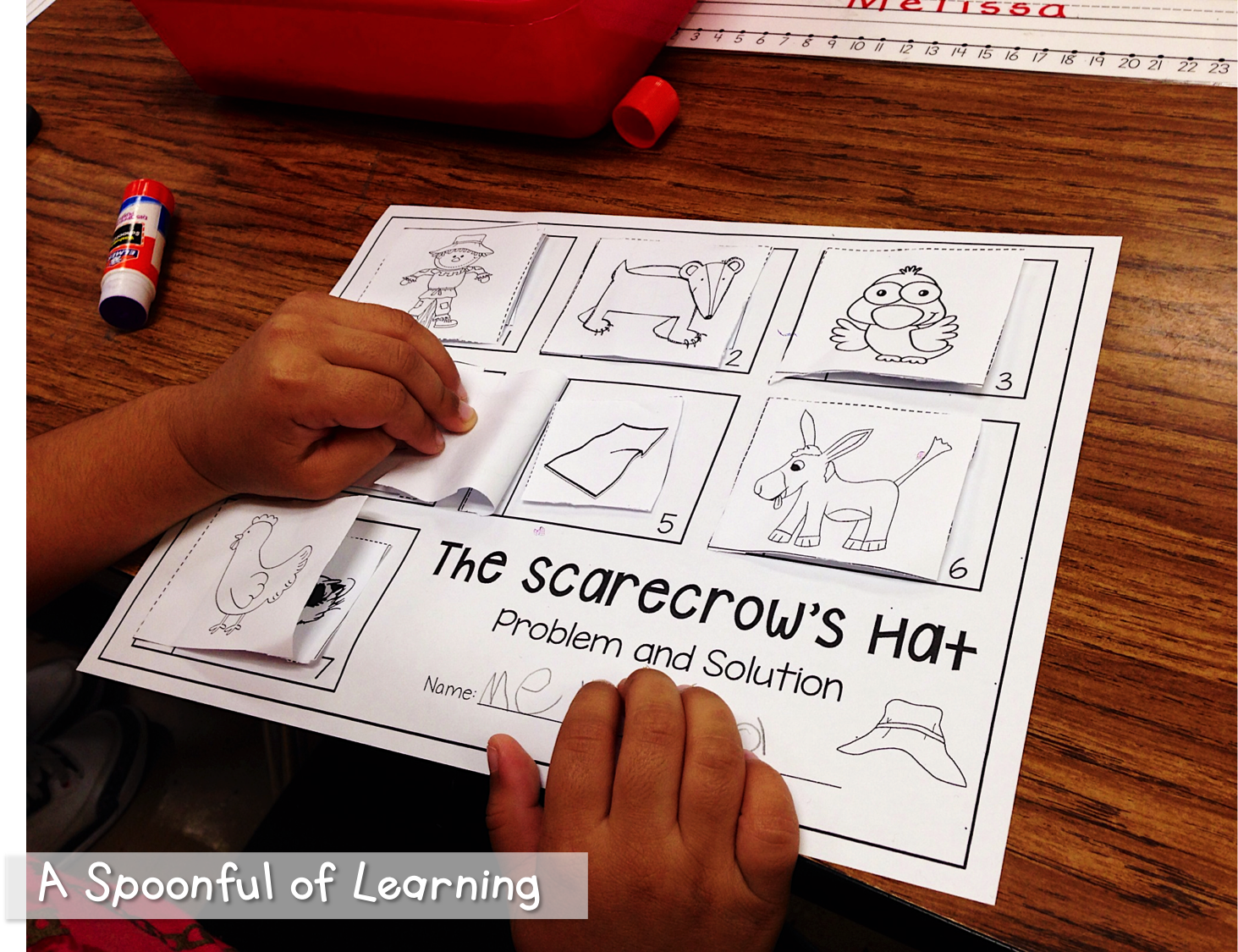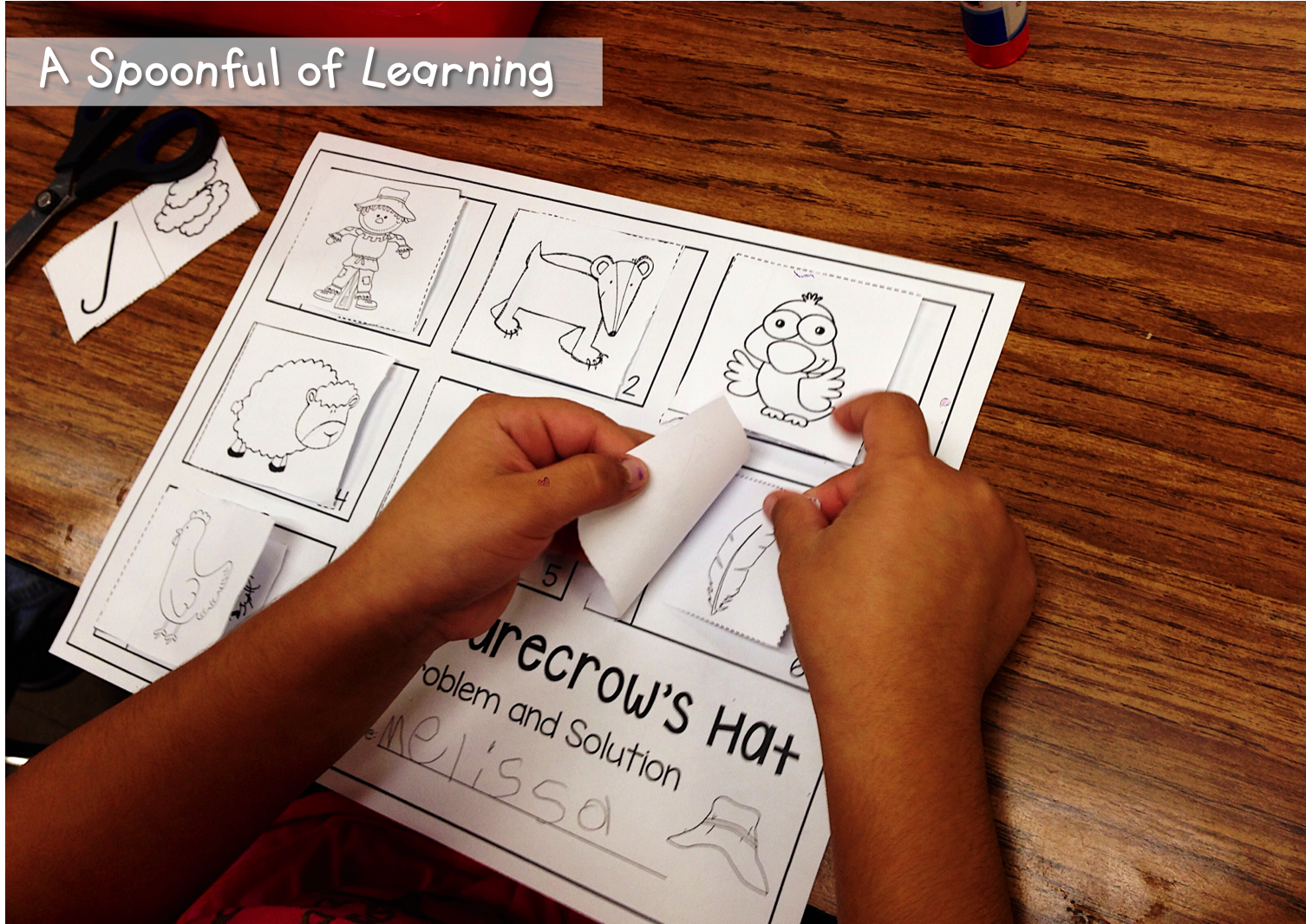 You can continue your practice with problem and solution by reading “The Scarecrow’s Hat” again. Then have students complete their very own problem and solution and activity. Glue the characters in the order they appeared in the story, then place the solution to the problem underneath the correct character.