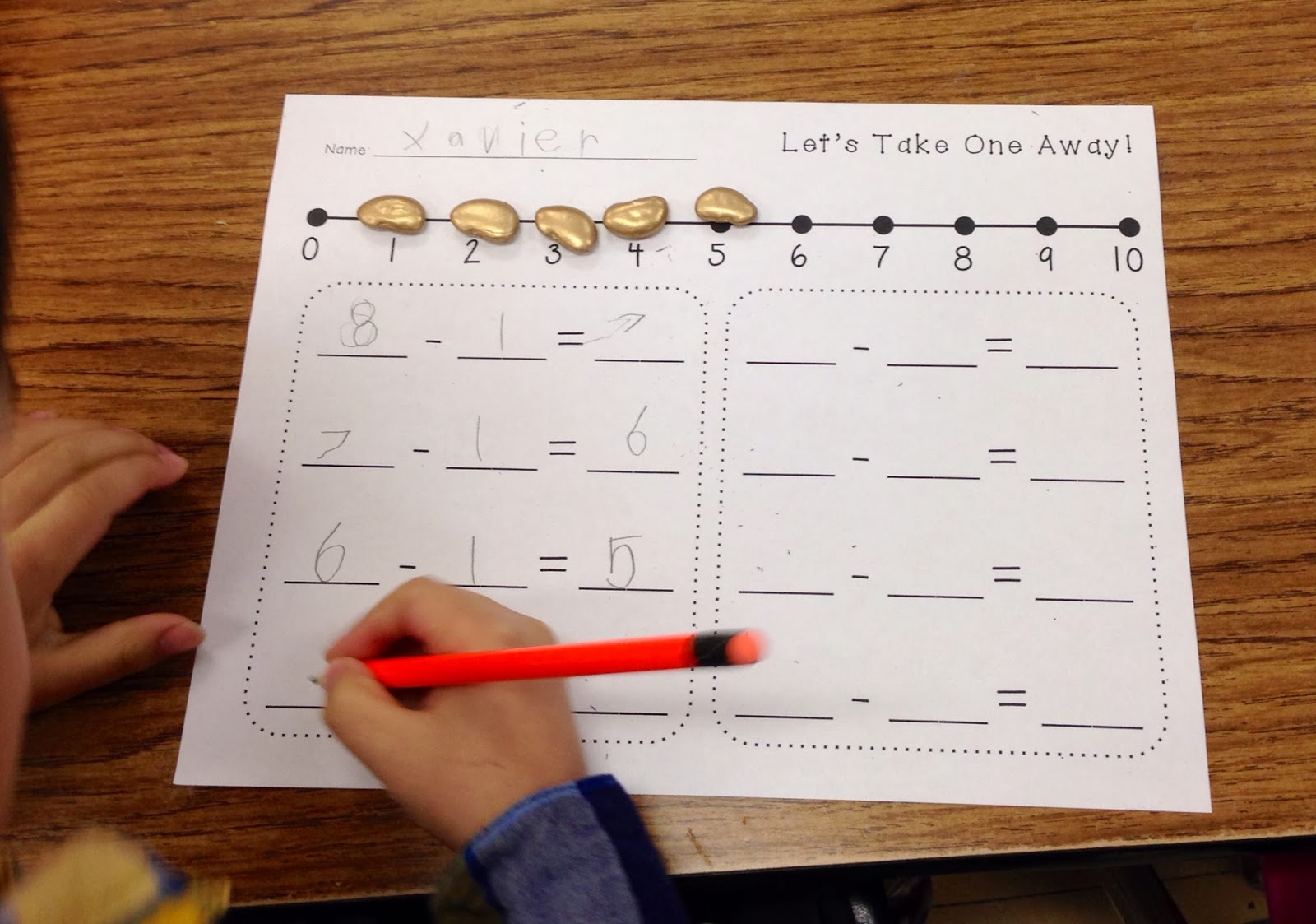 I had these painted beans from a St. Patrick’s Day activity that I do, so I decided to use these to help practice subtraction. The kids thought they were the neatest things ever! Crazy what beans a some gold spray paint can do to a child!
