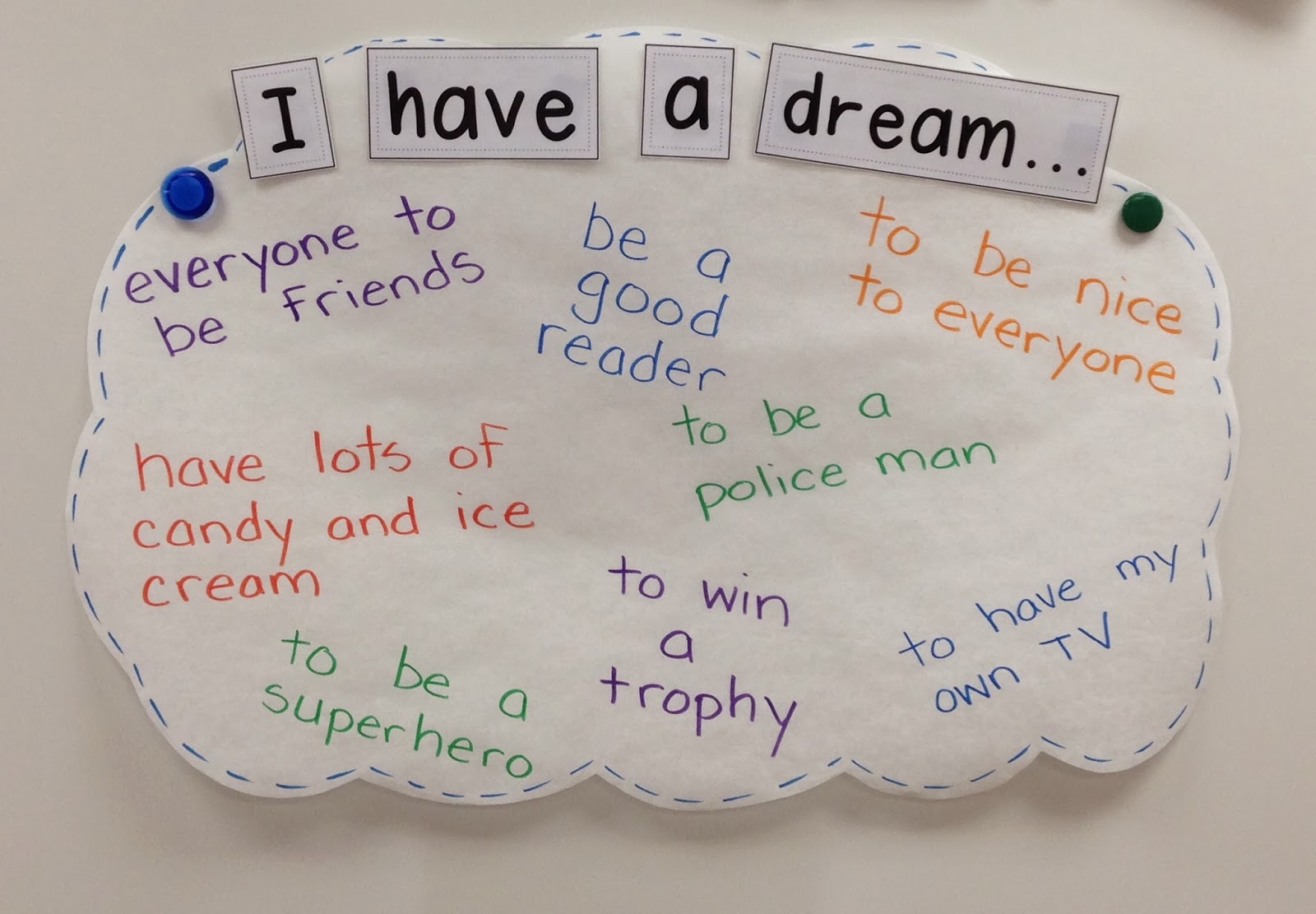 We talked about some of the dreams we have. They were so cute! My favorite dream that one of my students said is: “My dream is for Santa to come every night to give presents. I think other kids would like that dream too.” (LOVE my job!!!)