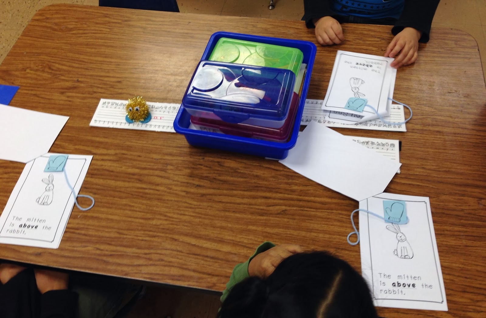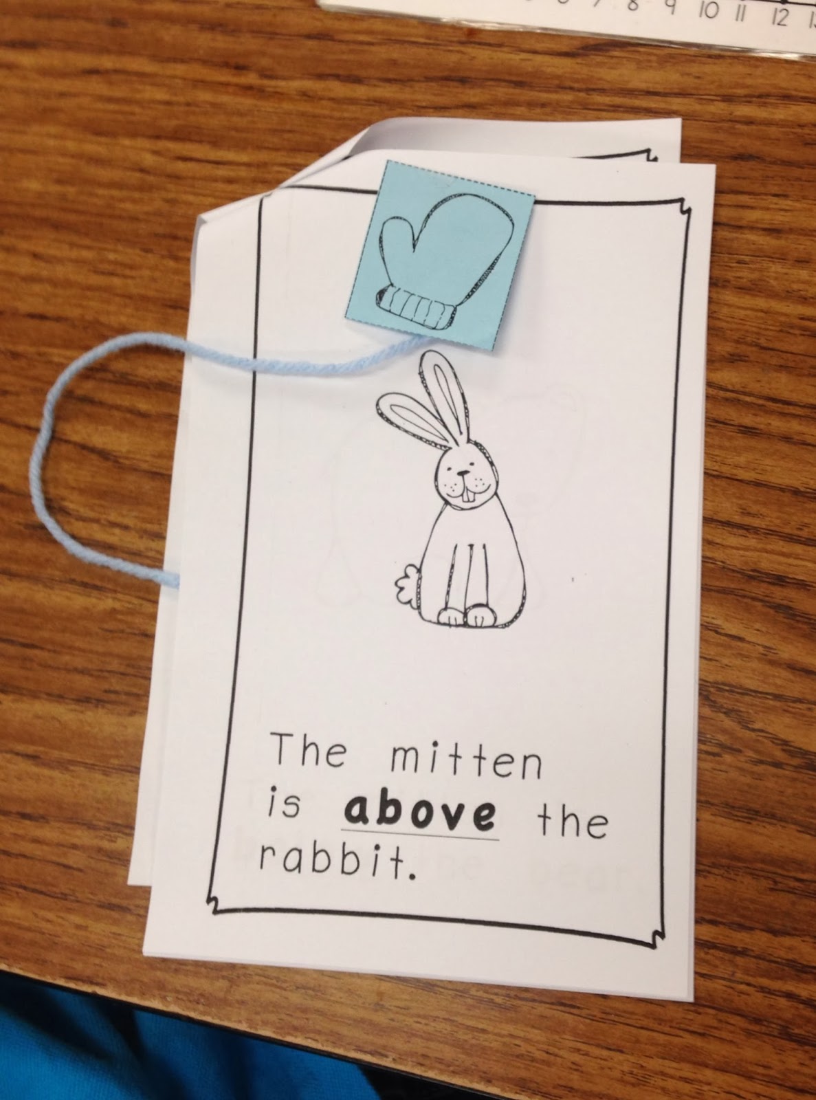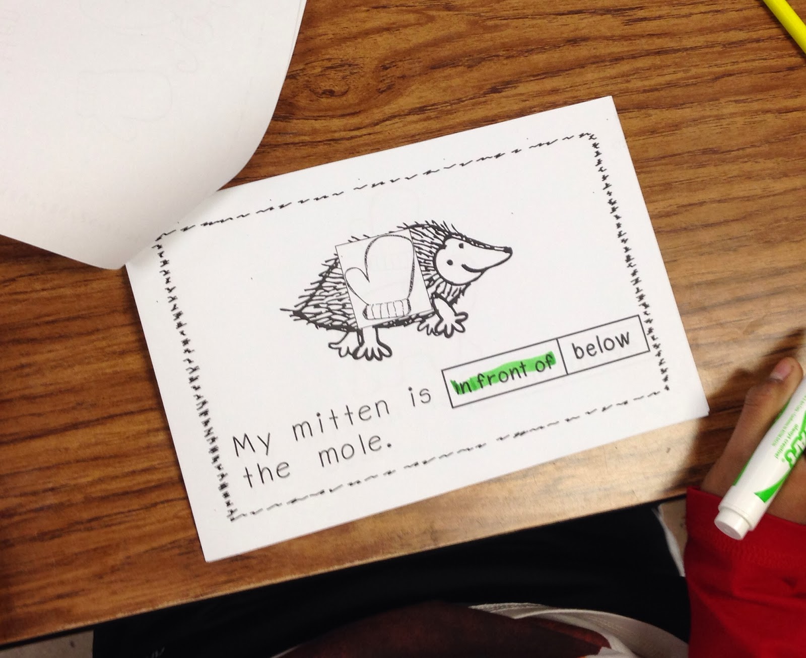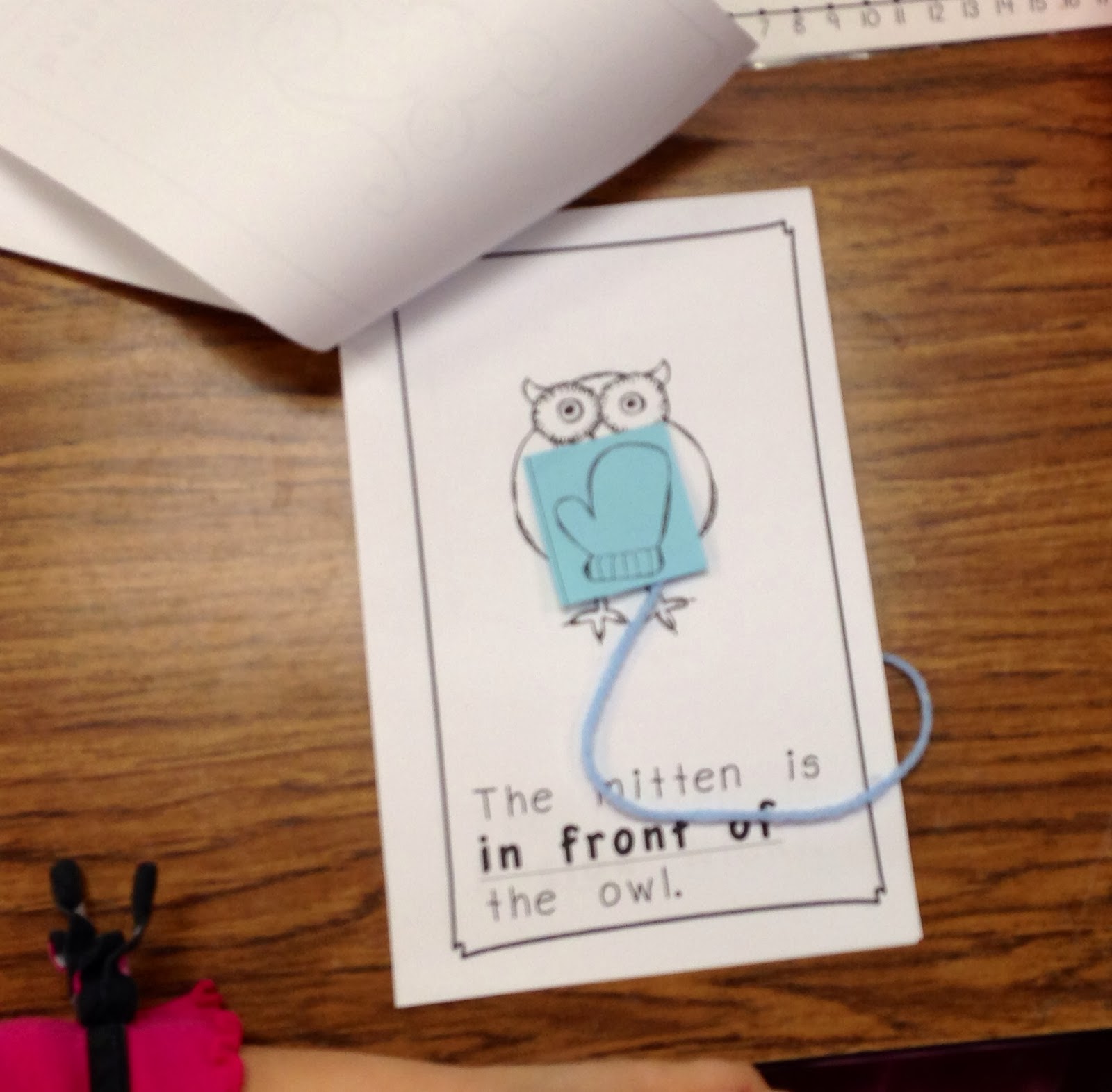 We practiced positional words by acting them out with a mitten in a mini positional book.