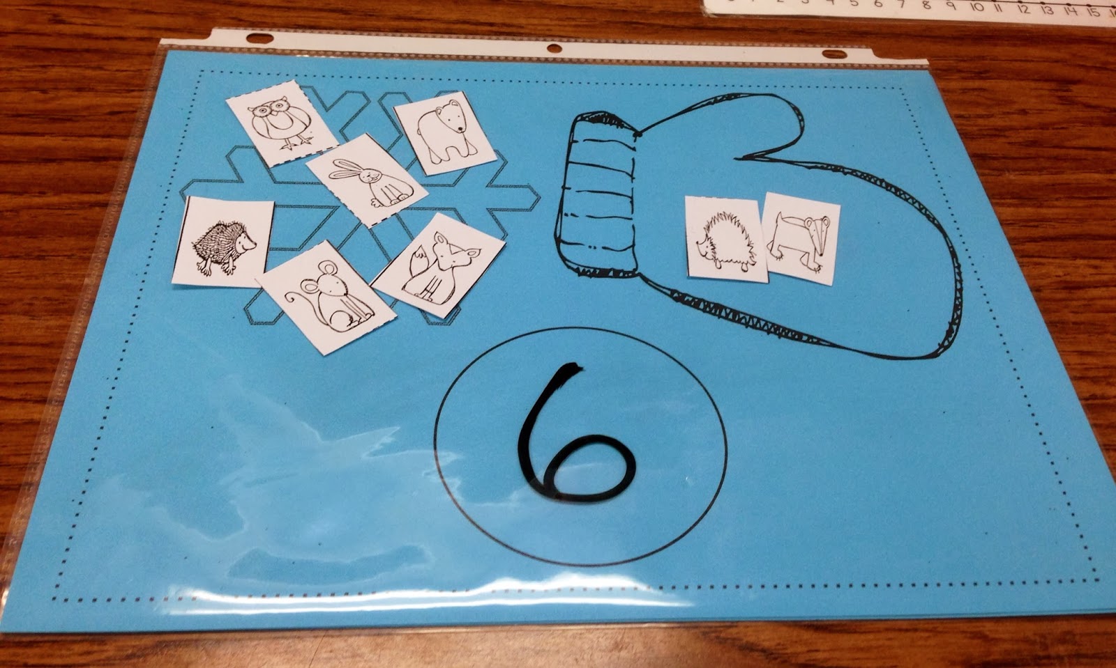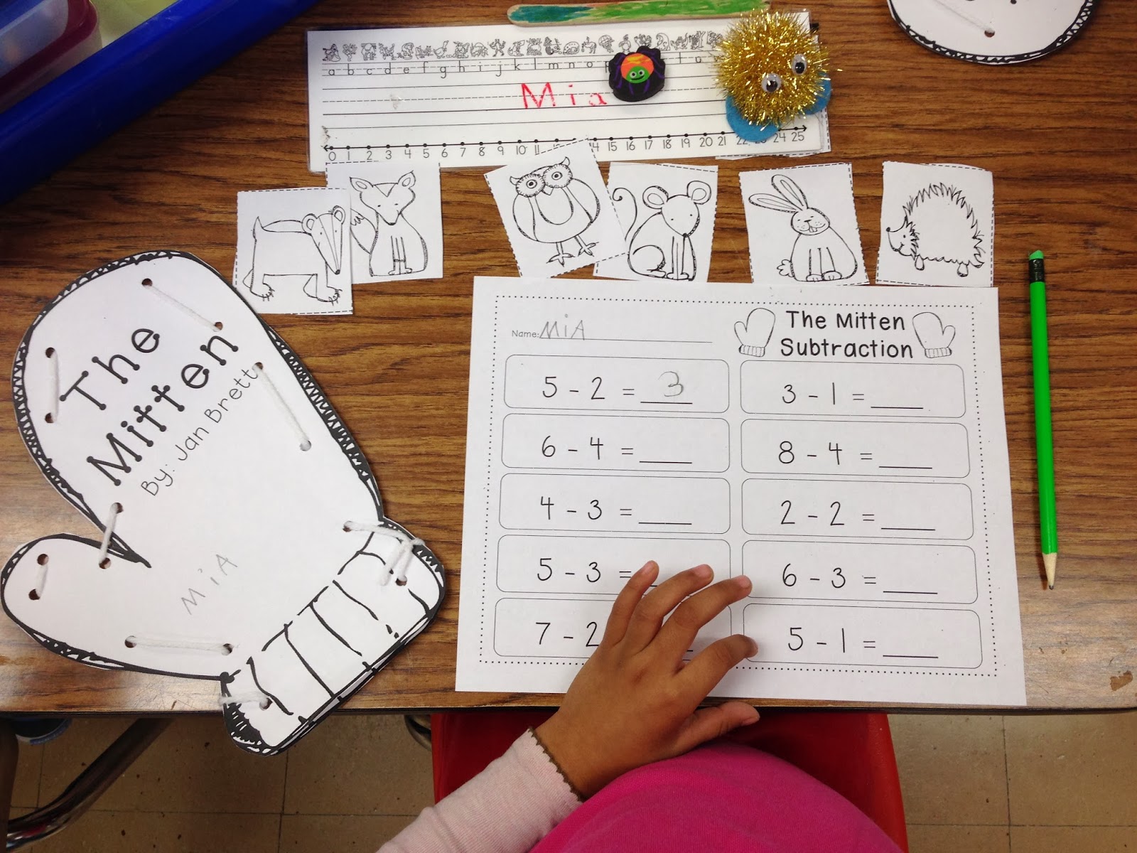 We then used animals from the story to act out subtraction equations with our ‘knitted’ mitten.
