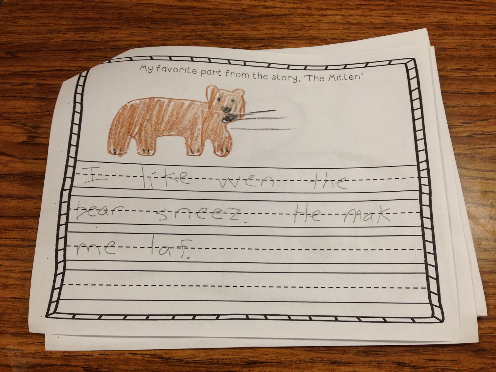 (LOVE this one: The candy bar went will go in the mitten because he had to go to sleep.)